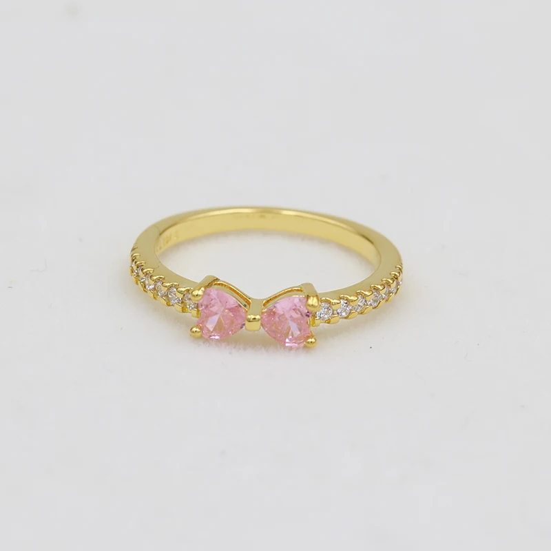 2025 New 14K Gold Plating Ring Sparkling Pink Bow Ring Princess Ring Original 925 Silver Color Finger Ring Fine Jewelry Women Gi