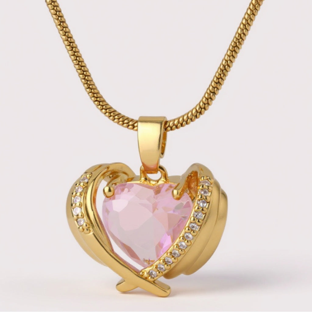 Célébrez l'amour avec le Pendentif Cœur Rosara. Ce magnifique collier présente un cœur en zircon cubique rose, délicatement enveloppé par des ailes dorées, symbolisant protection et affection. Fabriqué en acier inoxydable de haute qualité, ce pendentif est à la fois durable et éblouissant.